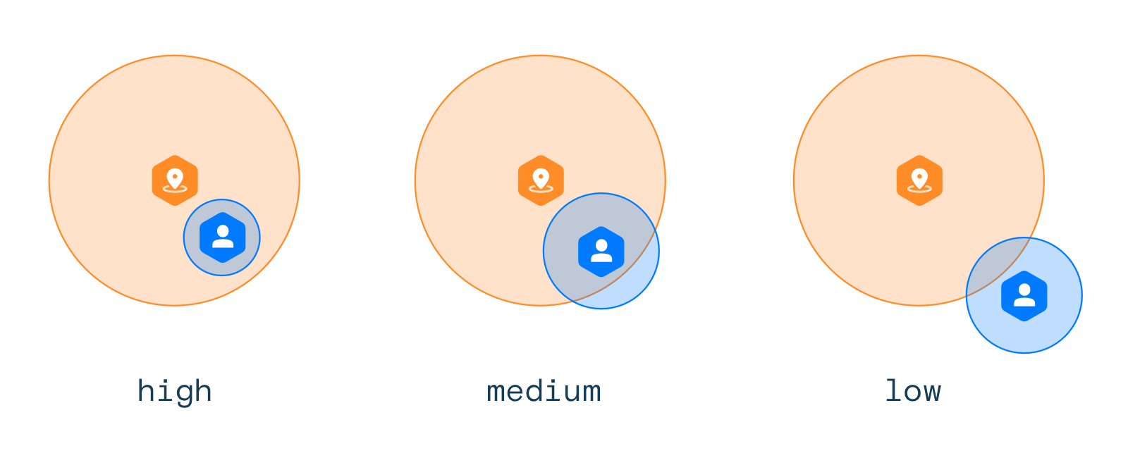 Confidence will be high when the user, taking into account the accuracy of the location reported by the device, is completely inside the geofence. Confidence will be medium when the user is mostly inside the geofence. Confidence will be low when the user is only partially inside the geofence.
