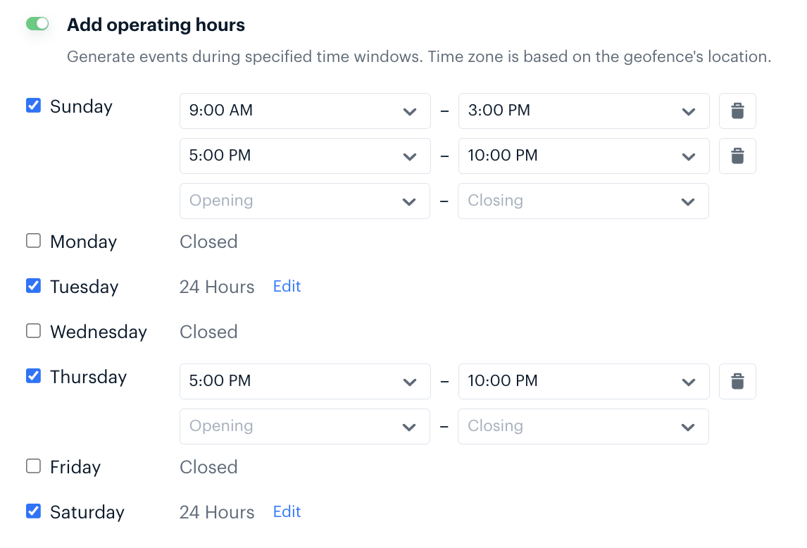 Operating hours can be set on individual geofences via CSV import, the API, or in the Advanced section of the geofence create and edit pages.